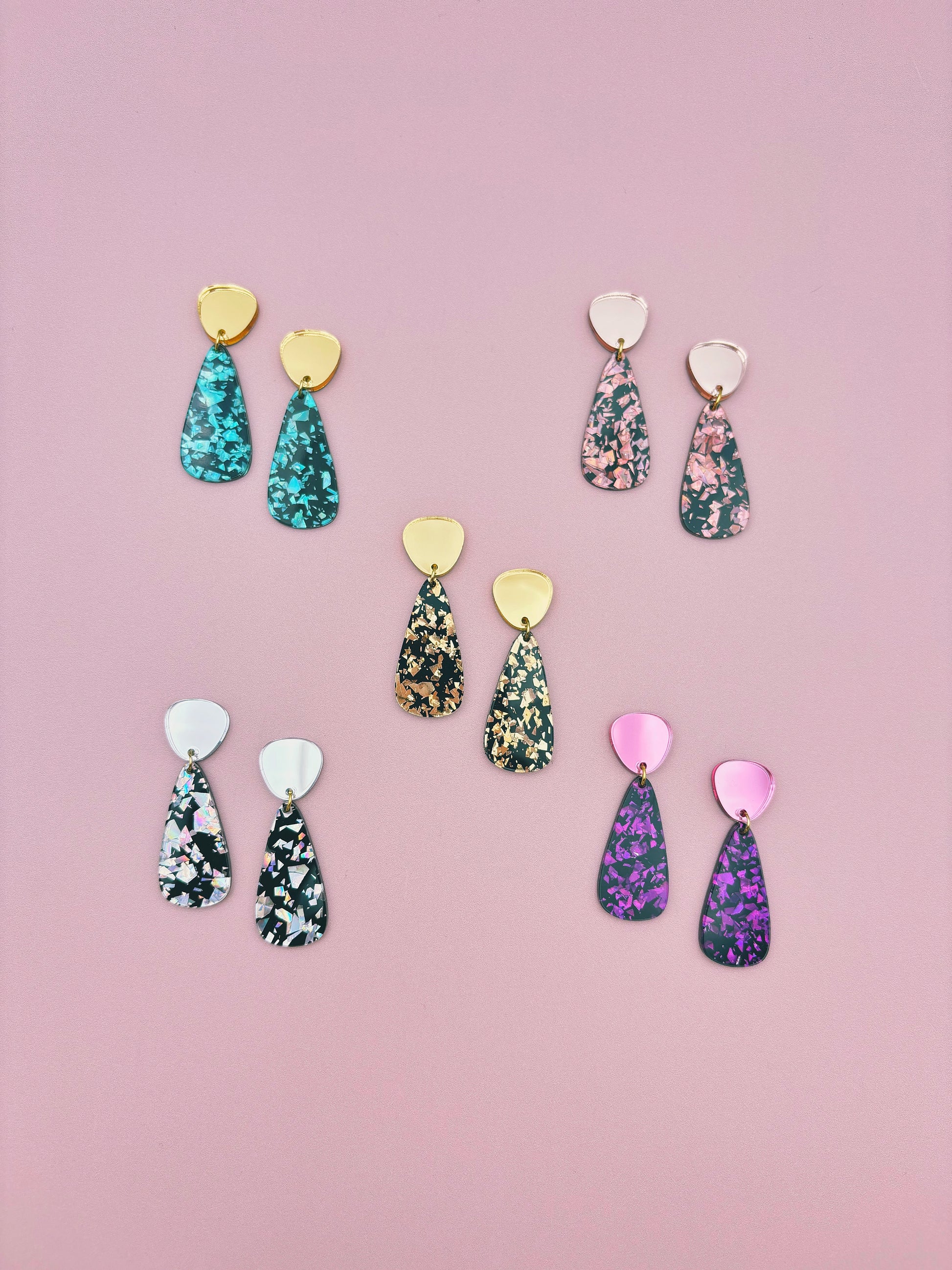 Matière : Acrylique avec tiges et attaches papillons en acier inoxydable doré à l'or 18 carats.