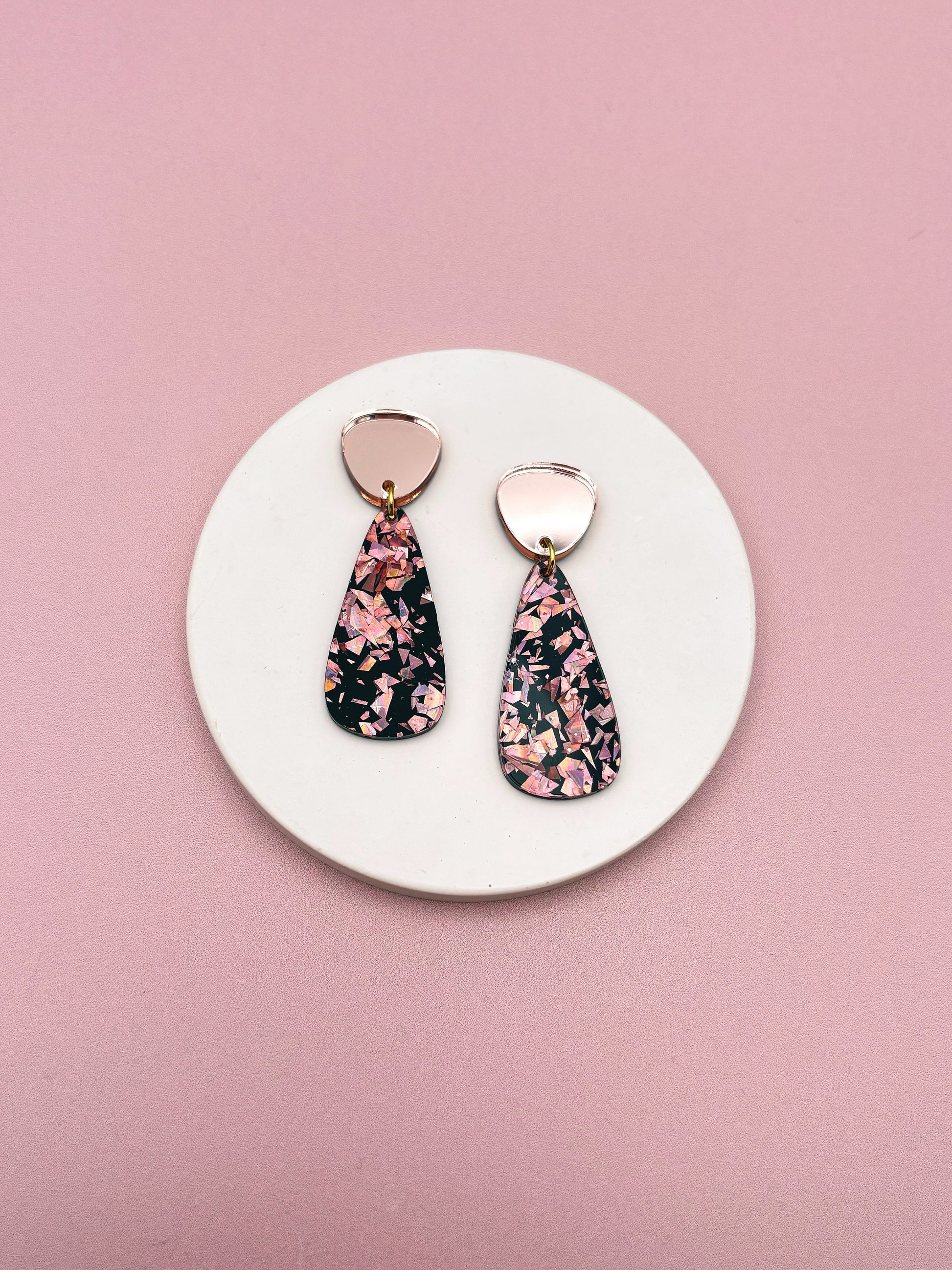 Un modèle graphique et raffiné qui joue sur les contrastes : noir profond, éclats pailletés façon terrazzo et reflets miroir.