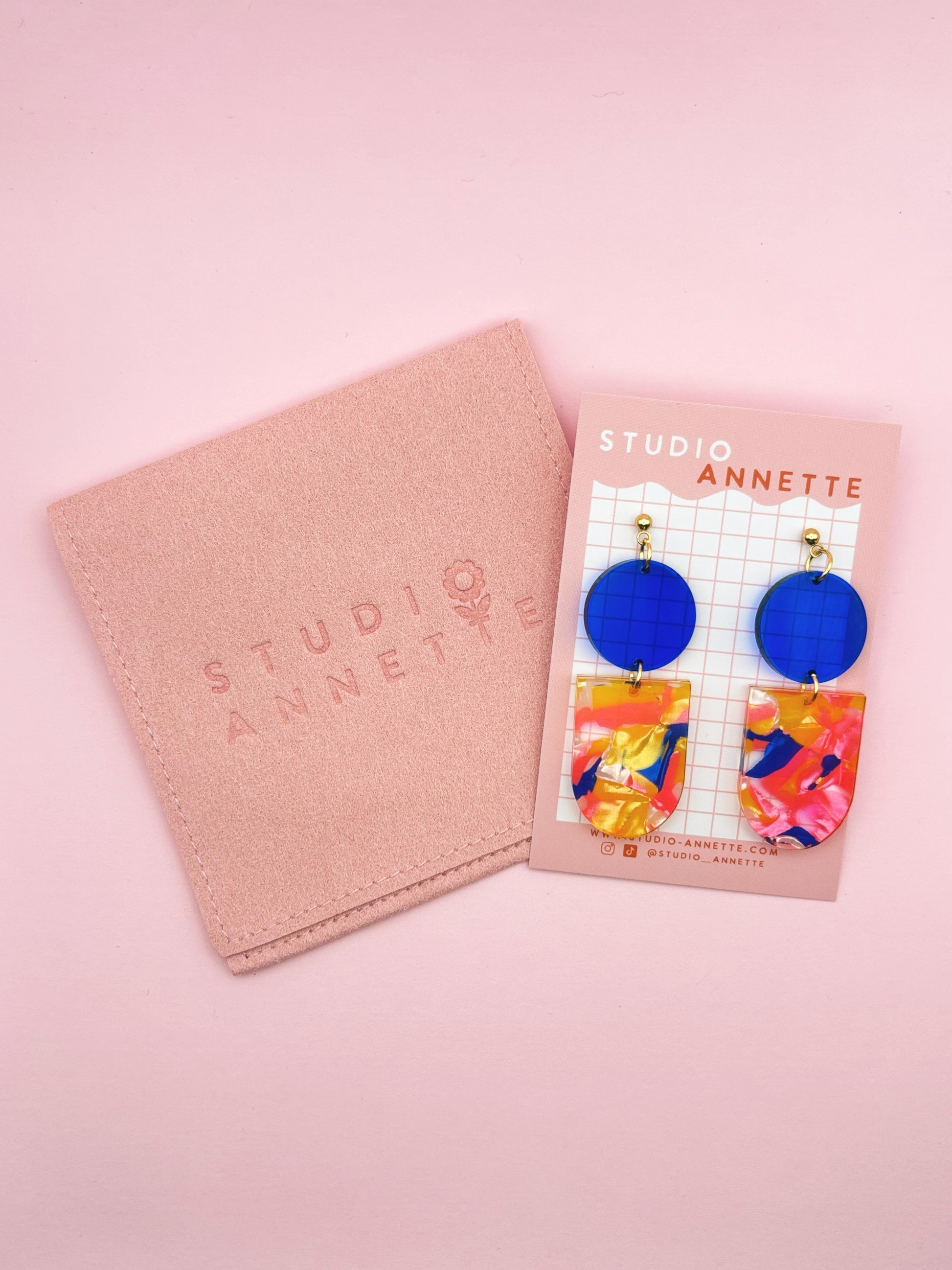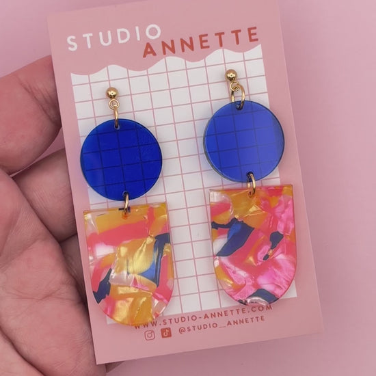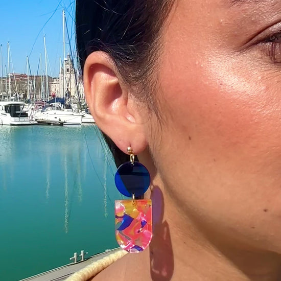 La pièce supérieure en acrylique bleu transparent contraste avec la partie inférieure en acrylique transparent effet terrazzo, composée d’éclats de couleurs vives. Le mélange crée un bijou lumineux et graphique qui attire naturellement l’œil.