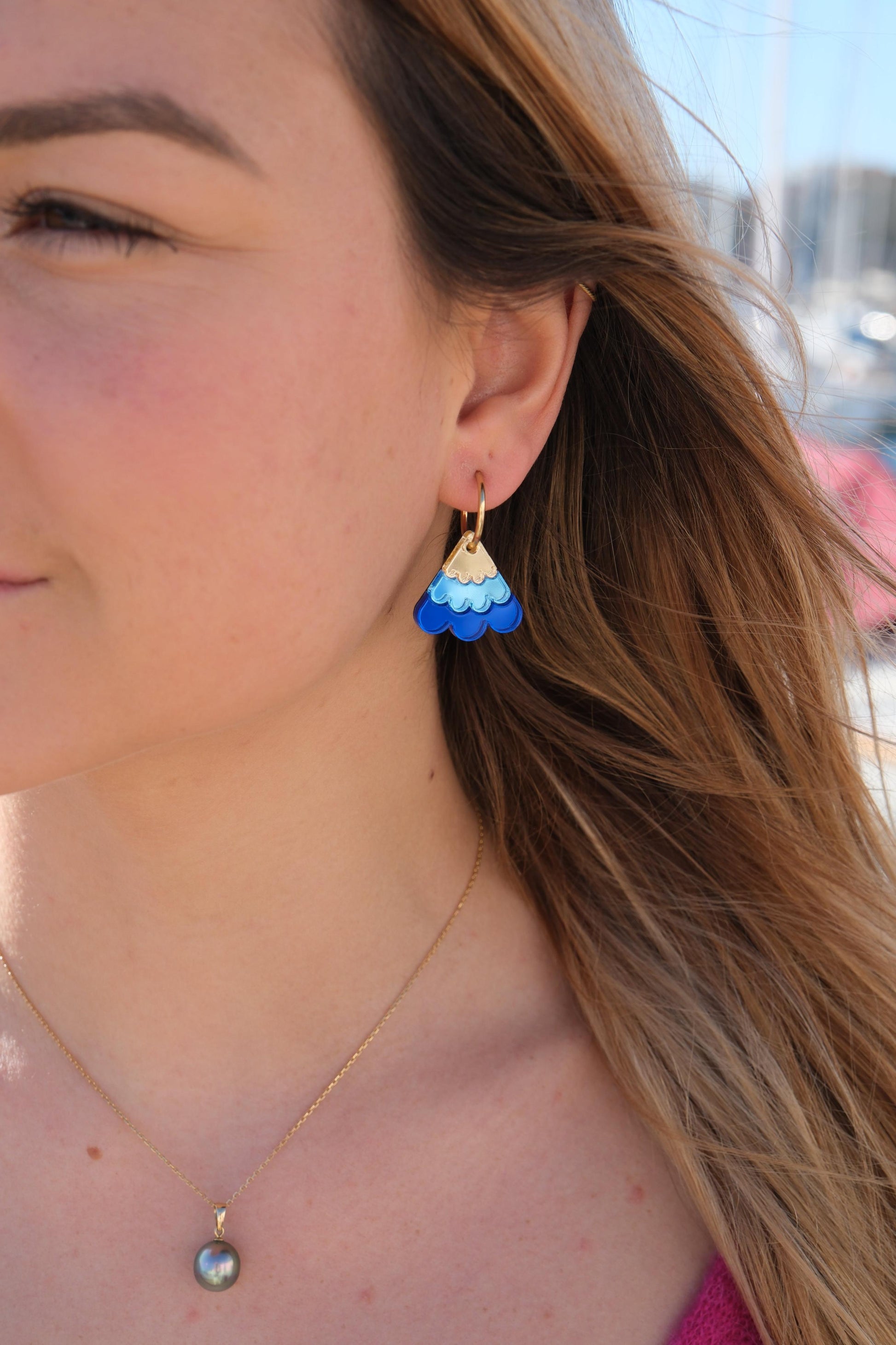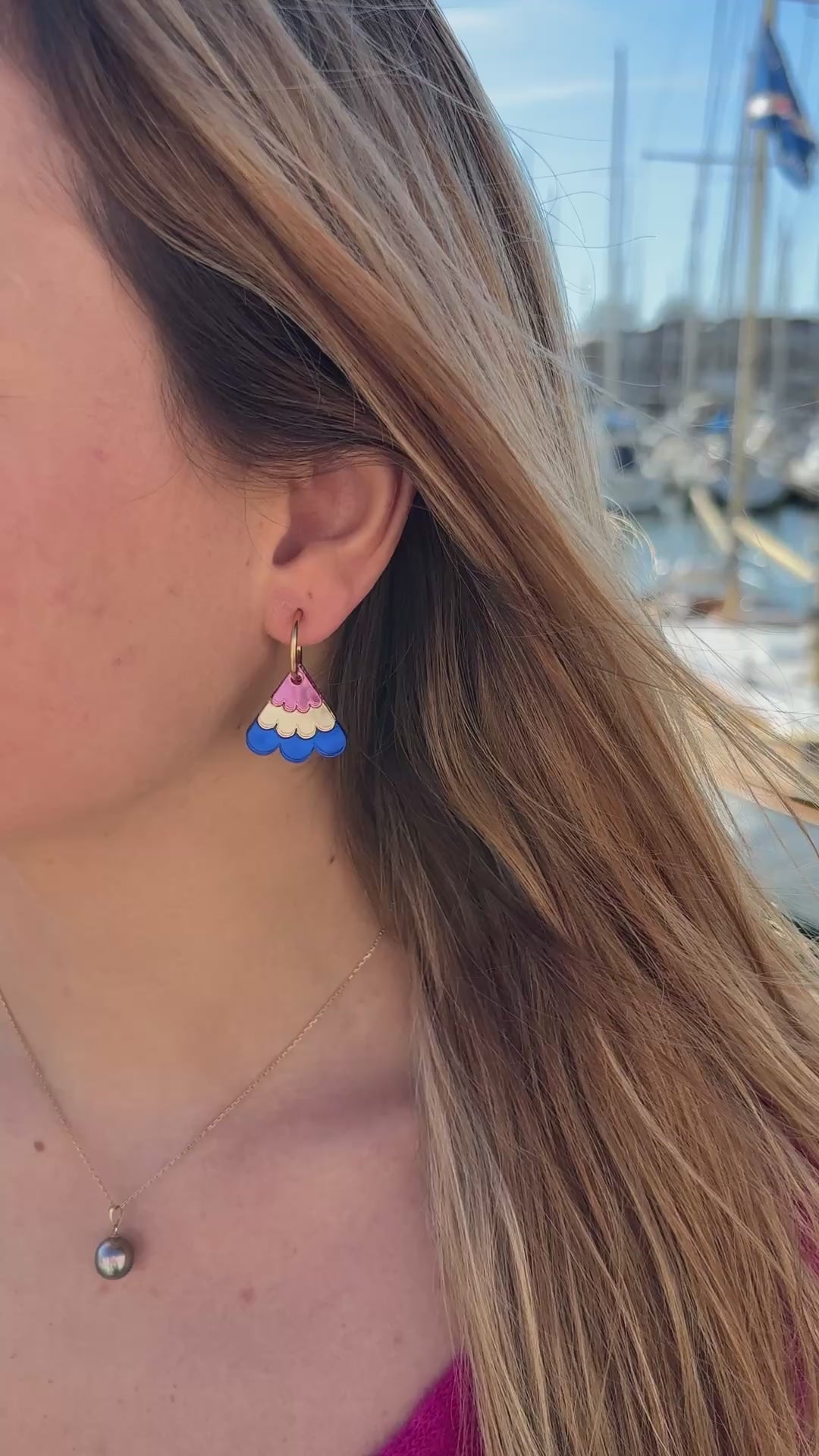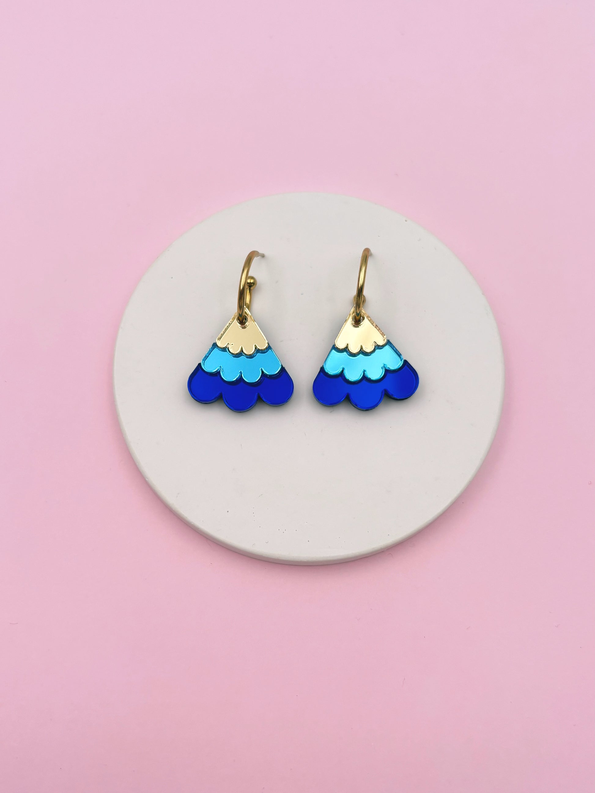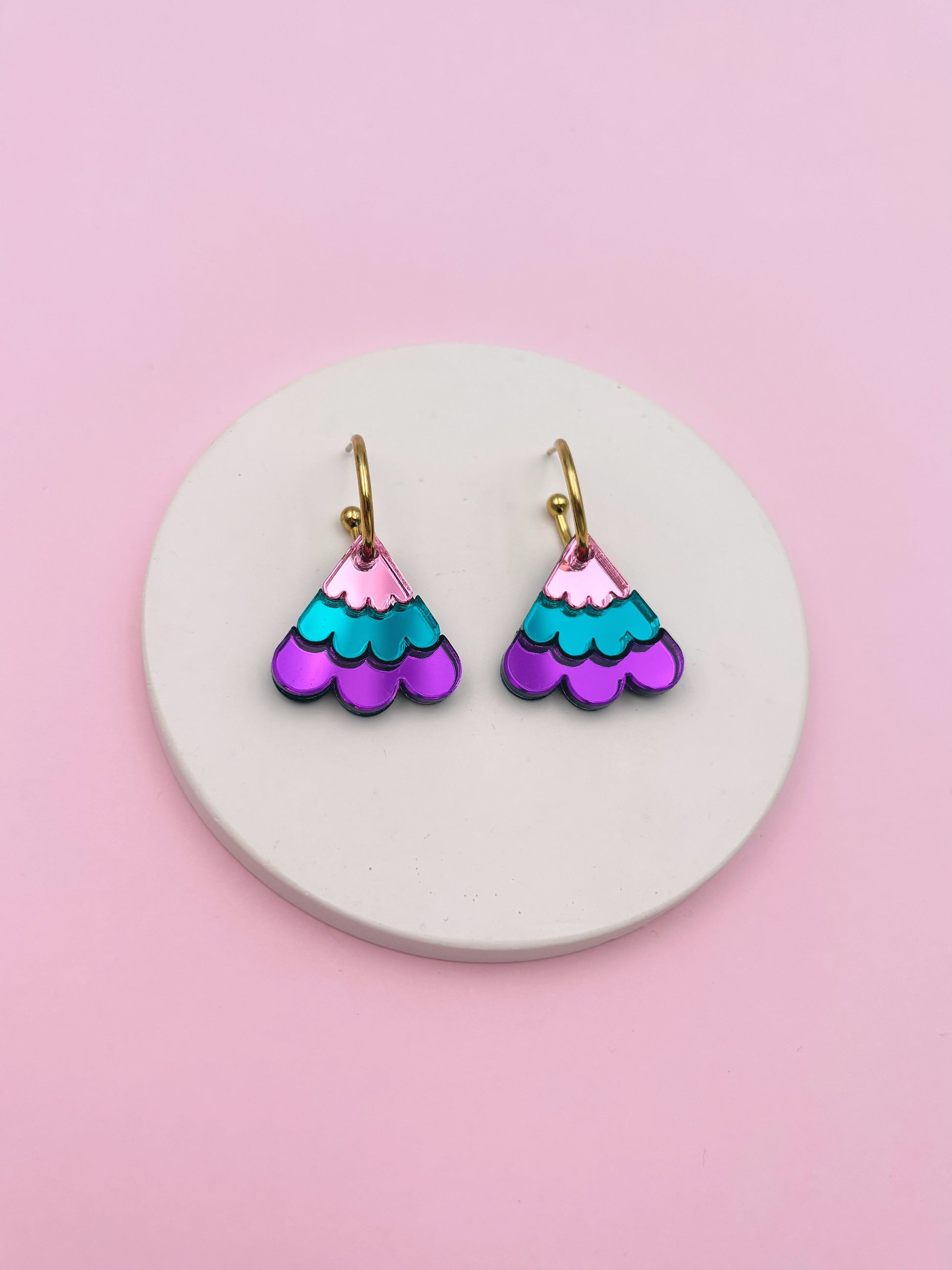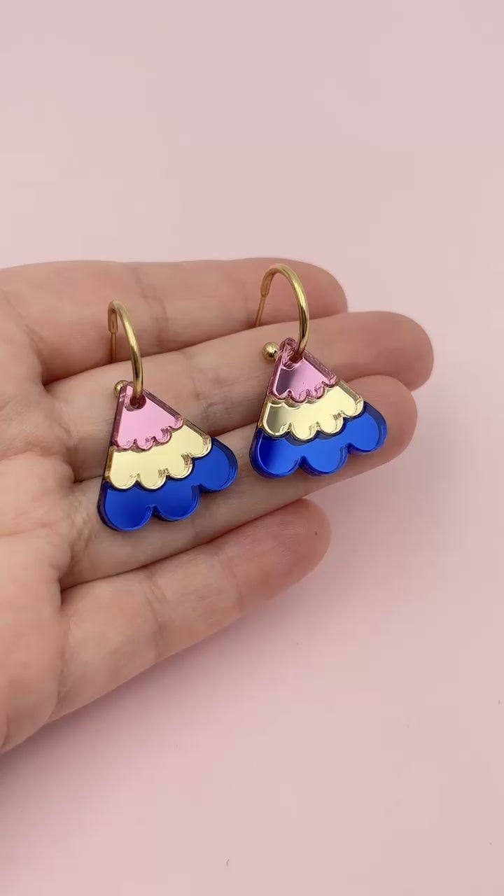 Matière : Acrylique avec créoles tiges et fermoirs papillons en acier inoxydable doré à l'or 18 carats.