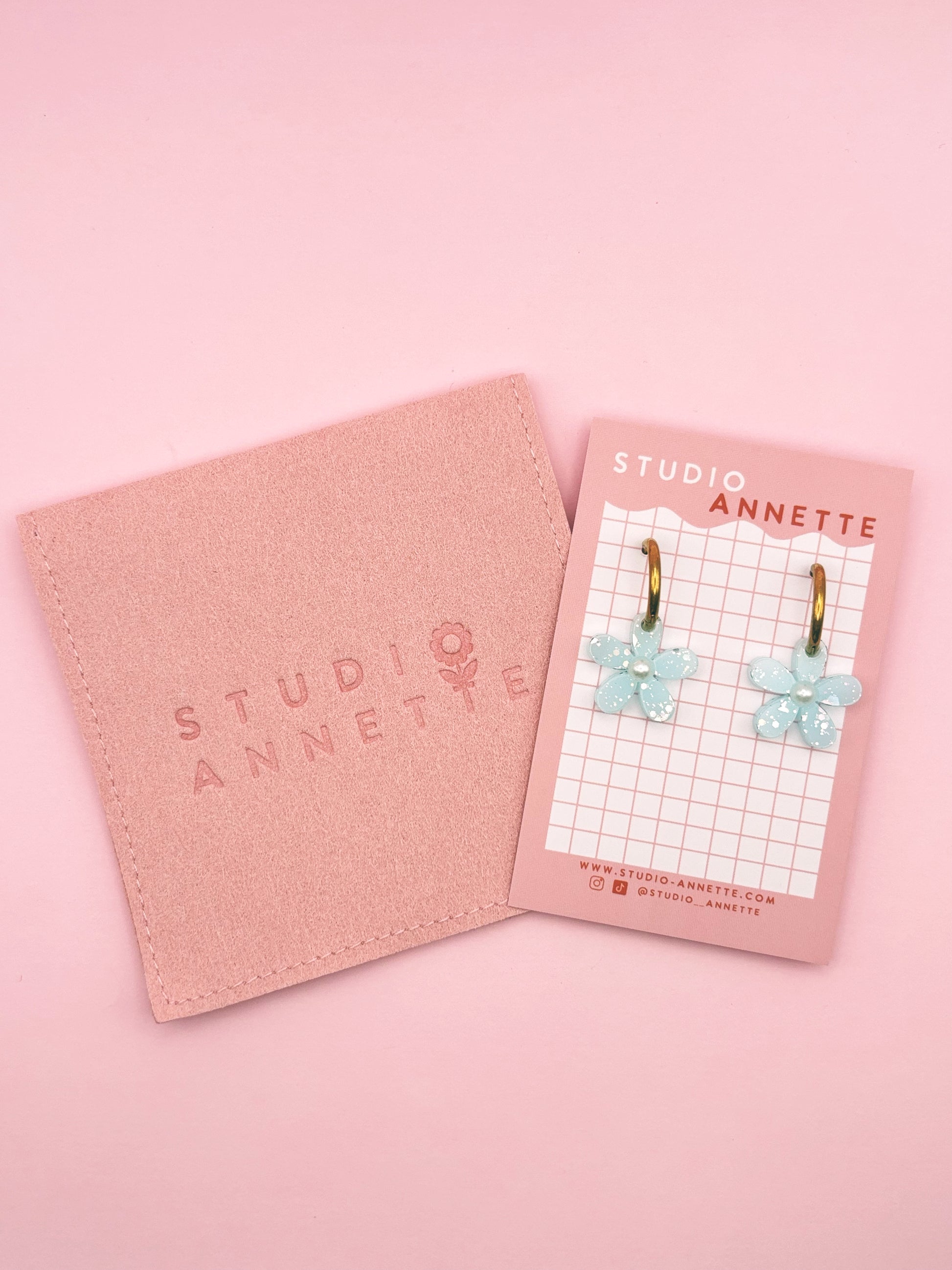 - Les boucles sont emballées dans un joli pochon en suédine rose au nom de la marque et expédiées dans une boîte customisée cartonnée